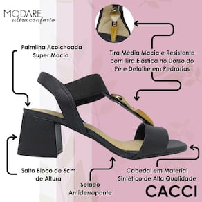 A Sandália Feminina Modare é confeccionada em material napa, sendo alta qualidade e durabilidade. Seu cabedal é composto por uma tira lisa acima dos dedos, uma tira com pedrarias e uma tira elástica. Conta com palmilha acolchoada confortável. A sandália se acomoda bem aos pés garantindo um calce perfeito, é perfeita tanto para o trabalho quanto para os passeios de fim de semana. Seu salto é em bloco e possui 7,0 cm de altura, dando maior sustentação em cada passo. Seu solado é fabricado em borracha antiderrapante.