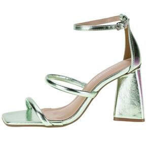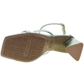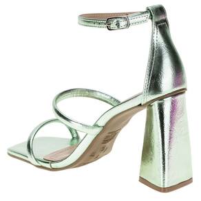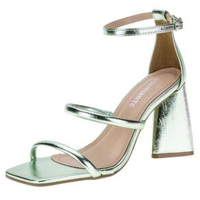 A Sandália Feminina Salto Grosso Via Marte é confeccionada em material metalizado com fechamento por fivela de ajuste, palmilha em PU e solado em borracha com salto de dez centímetros.