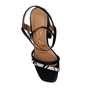 A Sandália é confeccionada em material sintético de alta qualidade e durabilidade. Seu cabedal é composto por duas tiras, uma das quais é adornada com strass, adicionando um toque de charme ao modelo. A palmilha é super macia e espumada, proporcionando conforto ao longo do dia. O fechamento é feito por meio de uma tira lateral ajustável, e duas tiras cruzadas próximas ao tornozelo adicionam um toque de estilo. O salto geométrico tem aproximadamente 10,0cm de altura e o solado é feito de PVC cristal.