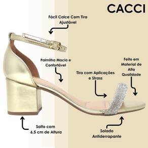 Possui sua tira com ajuste prático proporcionando um fácil calce, acompanhada uma linda tira em strass tornando-a mais especial e bela, seu solado é antiderrapante e trás muita segurança ao caminhar junto ao seu salto bloco super sofisticado. Sua palmilha macia e confortável, permanecendo sempre o conforto para todas as ocasiões. Leve com você os melhores calçados, vá para todos os lugares e combine looks incríveis com ela. Adquira já a sua Cacci!