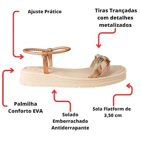 Estilo moderno: As sandálias flatform são conhecidas por seu estilo moderno e contemporâneo. Elas frequentemente incorporam elementos de moda, como tiras ajustáveis, Muito Brilho e materiais de tendência.