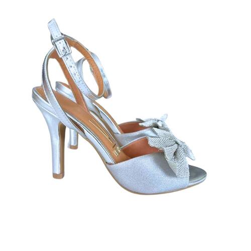 Sandália Feminina Vizzano Salto Alto Destalhe Laço Sandália Feminina Vizzano Salto Alto Destalhe Laço possui um cabedal em lona metálica, oferecendo um acabamento elegante. O material de fabricação é lona com detalhes em metal, garantindo durabilidade e estilo. O bico é simétrico, com tiras de espessura média posicionadas em sentido reto próximo aos dedos. O fechamento é feito por fivela lateral, facilitando o ajuste. A construção é delicada, com salto alto de aproximadamente 10 cm. A palmilha é acolchoada para conforto, e a calcanheira é levemente estruturada. O forro interior é em material têxtil, e o solado é em emborrachado, proporcionando aderência. O estilo é sofisticado com um design moderno e detalhes decorativos metálicos.