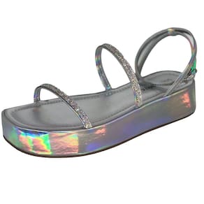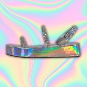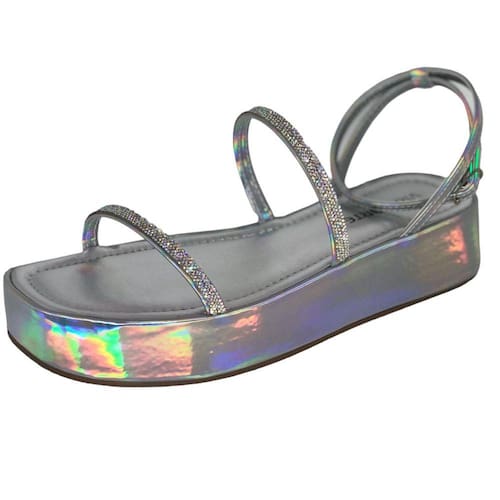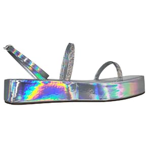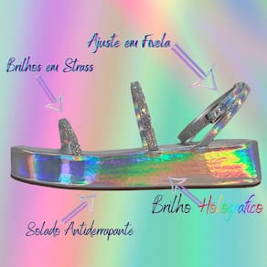 O grande destaque desta sandália é o seu acabamento holográfico, que cria um efeito visual deslumbrante e hipnotizante. As cores se transformam com o movimento, refletindo uma variedade de tons e adicionando um toque de magia a cada passo que você dá.