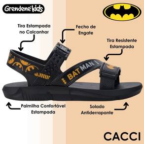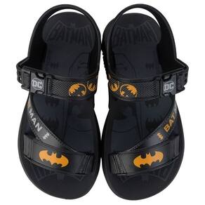 A sandália, conta com a sola e tiras estampadas, dando foco ao personagem Batman, fechamento com regulagem e calce prático.