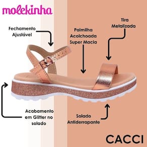 Com a Sandália Molekinha, as meninas estarão sempre prontas para brilhar, com muito conforto e estilo. Um modelo que une praticidade e charme, perfeito para transformar qualquer momento em uma ocasião especial!