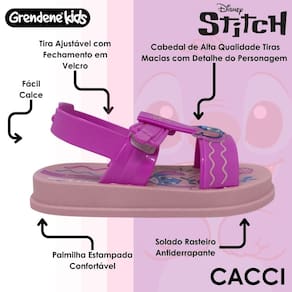 Com tiras macias e ajustáveis, que contam com fechamento em fecho aderente, a sandália garante um calce fácil e rápido, proporcionando mais autonomia para as crianças e praticidade para os pais. O cabedal de alta qualidade traz o charme do Stitch em um toque lúdico que deixa o visual ainda mais encantador. Além disso, sua palmilha estampada e superconfortável abraça os pezinhos com suavidade, enquanto o solado rasteiro antiderrapante oferece segurança a cada passo, seja em casa, no parque ou em momentos de diversão com a família.
