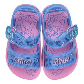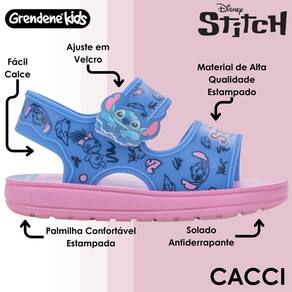 Cheia de encanto, a palmilha e as tiras trazem elementos característico do personagem Stitch, além do fechamento com tira autocolante que garante facilidade no calce e ganha um charme a mais com um aplique personalizado na lateral.