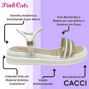 A palmilha anatômica acolchoada oferece um conforto incrível, proporcionando maciez a cada passo. Suas tiras resistentes e maleáveis garantem um ajuste firme, sem apertar, dando segurança e liberdade ao caminhar. O cabedal, feito em material de alta qualidade, proporciona um toque suave e durabilidade para o uso contínuo.