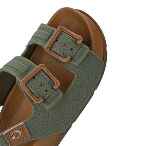 Com cabedal em material sintético de alta qualidade, a sandália oferece durabilidade e resistência ao uso diário. As tiras com ajuste autocolante facilitam o calce, garantindo que a sandália fique firme e segura nos pés.