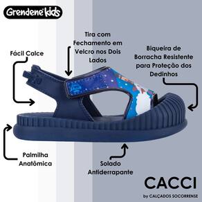 A nova sandália Mundo Bita possui a sola com biqueira. Conta com a divertida estampa do personagem em seu foguete, no espaço viajando rumo ao planeta Terra. A tira traseira conta com um passante que garante códigos dos modelos esportivos e facilita ainda mais o calce. A regulagem é ótima pois possui tira autocolante nos dois lados.