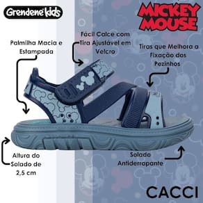 -Sandália com tiras estampadas trazendo elementos reconhecidos do Mickey;