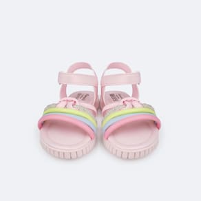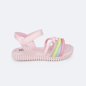 Sandália infantil feminina em sintético rosa, com tiras coloridas na parte frontal  formando um nozinho, sendo uma delas formando em strass, moderna e autêntica para as meninas que amam unir conforto e estilo! Papete com palmilha anatômica, confortável e flexível para cuidar do bem estar dos pezinhos. Papete infantil com calce fácil, facilitando o calce para as meninas. Solado feito em material emborrachado que possui aderência com o chão, proporcionando flexibilidade, menor desgaste e maior resistência térmica.