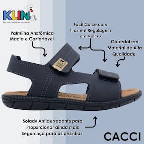 A Sandália Infantil Menino Tictac Klin foi desenvolvida para oferecer o melhor em conforto e praticidade para os pequenos. Com um design moderno e funcional, ela conta com duas tiras ajustáveis autocolantes, proporcionando um calce fácil e um ajuste firme e seguro para todas as aventuras do dia.