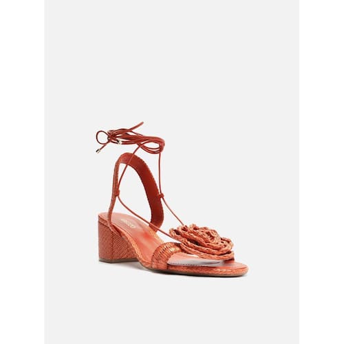 Descrição: Sandália laranja em material texturizado. O modelo tem salto médio bloco e bico redondo. Traz tira média sobre os dedos com aplicação de flor grande. Duas tiras finas se conectam à tira frontal, passam pelo peito do pé, contornam o tornozelo e fecham em amarração superior. Possui ainda tira média em torno do calcanhar. Com palmilha da cor do modelo e inscrição do nome da marca.