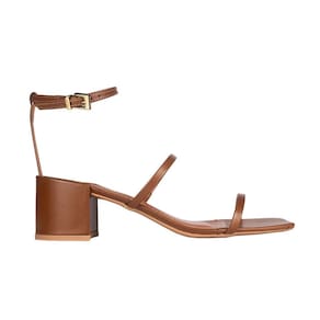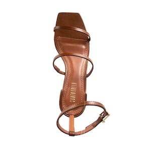 A sandália confeccionada em material confort é um modelo que combina estilo e praticidade. Com bico quadrado e salto médio bloco, design inclui tiras finas e uma tira adicional que contorna o tornozelo, com fechamento em fivela proporcionando ajuste elegante.