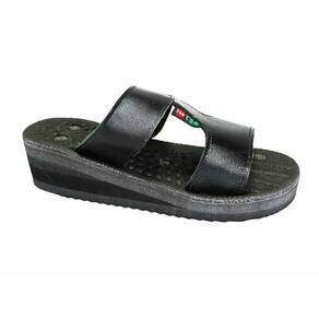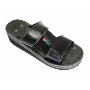 Detalhe Técnico: Sandália Feminina com Salto Charme II – couro polvora semi brilho com tecnologia em reflexologia e magnetoterapia. A Sandália Charme II foi desenvolvida para oferecer elegância, estabilidade e benefícios integrados ao uso diário. Produzida em couro polvora semi brilho, de textura macia e toque suave, seu cabedal envolve os pés com firmeza e conforto, proporcionando excelente ajuste anatômico, sem pontos de pressão. O modelo possui salto e estruturado, que favorece o alinhamento postural e distribuição equilibrada do peso corporal, ideal para quem busca sofisticação sem comprometer a saúde dos pés. A palmilha é anatomicamente desenhada com saliências distribuídas conforme os pontos de reflexologia podal e da técnica oriental Doin, estimulando a planta dos pés a cada passo. Esse estímulo contínuo atua de forma direta na melhora da circulação periférica, no relaxamento muscular e no alívio de tensões acumuladas. Além disso, a base conta com magnetos estrategicamente posicionados, aplicando a magnetoterapia passiva, que favorece o equilíbrio energético, redução de inchaços, oxigenação dos tecidos e recuperação muscular. Características Técnicas: Material: Couro polvora semi brilho preto – macio, resistente e com acabamento natural Palmilha anatômica: com saliências para reflexologia e estímulo Doin Tecnologia magnética: 14 magnetos distribuídos conforme pontos de podologia energética Salto firme e com boa base de apoio Solado: EVA leve, com absorção de impacto e aderência Indicação: Uso diário; ideal para quem busca conforto, alívio de dores plantares e estimulação contínua