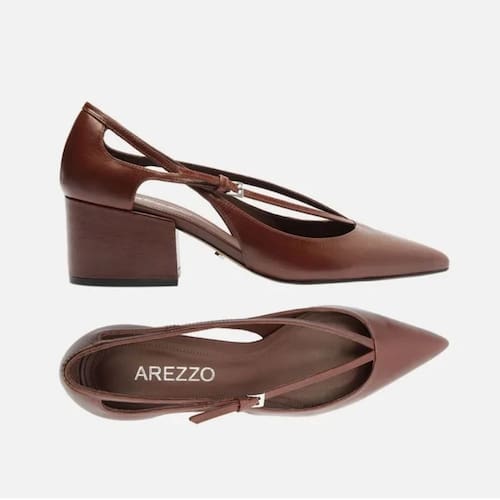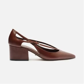 Descrição: Scarpin marrom em couro. O sapato tem salto médio bloco e ponta fina. Semi aberto, possui recorte nas laterais. Traz tiras finas em V conectadas ao cabedal, uma delas com fivela metálica, que seguem pelas laterais até o calcanhar, e outras duas tiras finas contínuas ao cabedal, que vão das laterais até a parte traseira, cruzando com as demais tiras. Com palmilha da cor do scarpin e inscrição do nome da marca. Referência: A1365600010003