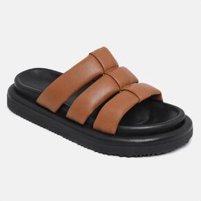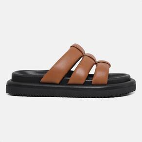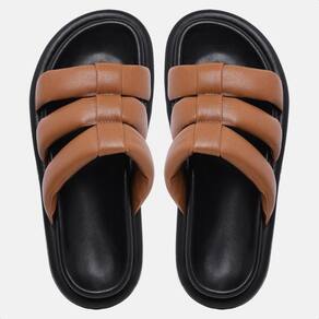 Esta papete de couro tem um design moderno e elegante. As três tiras largas em couro metálico, com um leve brilho, proporcionam um visual sofisticado, destacando-se pela aparência luxuosa. As tiras acolchoadas garantem conforto e firmeza ao pé. A sola de 4cm preta, é robusta e ligeiramente elevada, feita de borracha, oferecendo boa tração e amortecimento. O contraste entre o dourado metálico das tiras e a sola preta cria um visual estiloso e contemporâneo, ideal para quem busca um calçado confortável, mas com um toque de glamour.