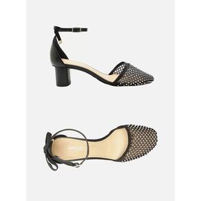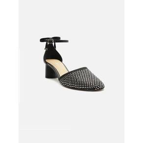 Descrição: Scarpin preto. O modelo tem salto baixo bloco arredondado metalizado e bico redondo. Traz cabedal em tecido tela com aplicação de strass. Aberto nas laterais e fechado no calcanhar em couro, possui tira fina em torno do tornozelo com fivela lateral e laço traseiro. Com palmilha bege e inscrição do nome da marca. Exibe todo o peito do pé. Referência: A1322600120001