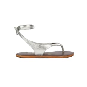 Essa confortável sandália rasteira prata traz uma proposta sexy e sofisticada para seus looks de verão! O design clean em couro metalizado traz elegância imediata, enquanto as tiras tipo thong sandal e o fechamento com amarração de fita no tornozelo deixam esse modelo super cool. Aposte!