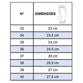 Recomendações de Uso: A limpeza do calçado pode ser feita com Detergente neutro e pano úmido. Não deixar submerso em água e não utilizar nenhuma forma de calor para secar. Guardar em local sem umidade.