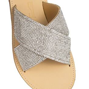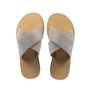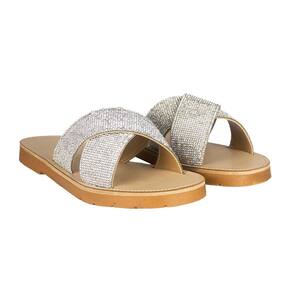 Sandália Rasteira, confeccionada em material cristal. Possui solado flat, bico arredondado, palmilha texturizada com o logotipo da marca e se destaca pelas tiras cruzadas com detalhes em brilho.