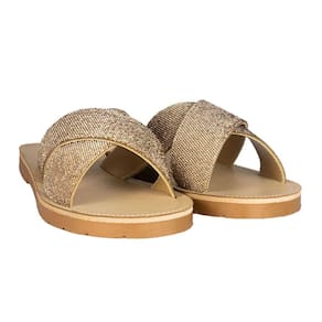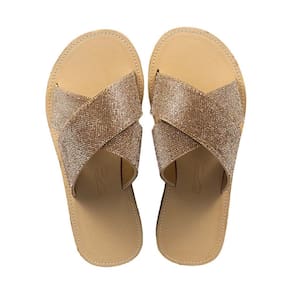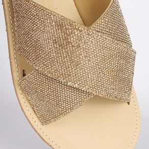 Sandália Rasteira, confeccionada em material cristal. Possui solado flat, bico arredondado, palmilha texturizada com o logotipo da marca e se destaca pelas tiras cruzadas com detalhes em brilho.