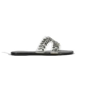 Essa sandália rasteira preta combina a praticidade do modelo slide com o glamour da aplicação de pedras sobre o vinil transparente, material que adiciona um toque trendy ao visual. Sabe aquele modelo fácil de usar e que faz toda a diferença no look? É essa sandália glam!