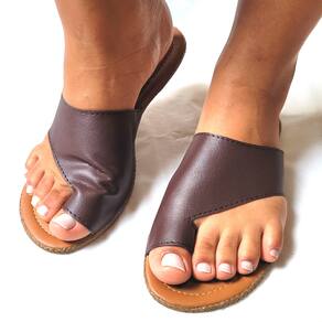 Sandália Rasteira Café de Dedo em couro sintético, palmilha macia e solado em PVC.