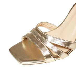 Linha de Sandália Salto Alto Fino Luiza Sobreira, produzida em material sintético na cor Dourada, com palmilha e forro em P.U., solado em TR, bico quadrado e fivela ajustável para fechamento.