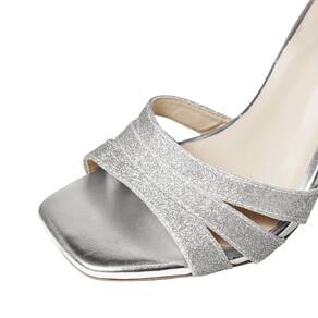 Linha de Sandália Salto Alto Fino Luiza Sobreira, produzida em material sintético na cor Gliter Prata, com palmilha e forro em P.U., solado em TR, bico quadrado e fivela ajustável para fechamento.