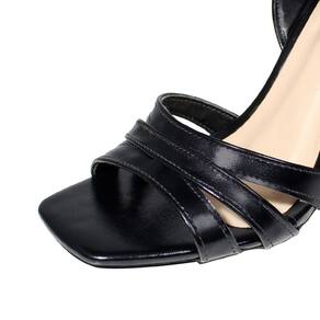 Linha de Sandália Salto Alto Fino Luiza Sobreira, produzida em material sintético metalizado na cor Preta, com palmilha e forro em P.U., solado em TR, bico quadrado e fivela ajustável para fechamento.