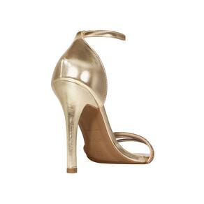 Linha de Sandália Salto Alto Fino Luiza Sobreira, produzida em material sintético metalizado na cor Dourada com detalhes em strass, com palmilha e forro em P.U., solado em TR, bico quadrado e fivela ajustável para fechamento.