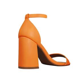 Linha de Sandália Salto Alto Grosso Luiza Sobreira, produzida em material sintético na cor Laranja, com palmilha e forro em P.U., solado em TR, bico quadrado e fivela ajustável para fechamento..