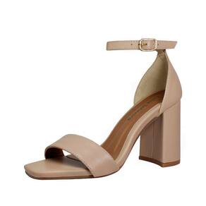 Linha de Sandália Salto Alto Grosso Luiza Sobreira, produzida em material sintético na cor Nude, com palmilha e forro em P.U., solado em TR, bico quadrado e fivela ajustável para fechamento..