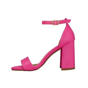 Linha de Sandália Salto Alto Grosso Luiza Sobreira, produzida em material sintético na cor Pink, com palmilha e forro em P.U., solado em TR, bico quadrado e fivela ajustável para fechamento..