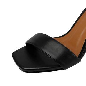 Linha de Sandália Salto Alto Grosso Luiza Sobreira, produzida em material sintético na cor Preta, com palmilha e forro em P.U., solado em TR, bico quadrado e fivela ajustável para fechamento..