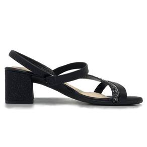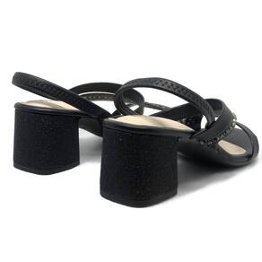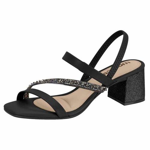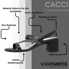 Seu cabedal é fabricado em material sintético, tem no peito do pé 3 tiras e uma decorada com strass. O salto é médio, bloco e acabamento no mesmo material do cabedal, possui aproximadamente 5 cm de altura é estável proporcionando conforto ao caminhar, o solado é emborrachado e possui frisos para maior segurança, a palmilha é fixa, almofadada e apresenta a logo da marca, o calcanhar é aberto e o fechando é por tira melavél no tornozelo facilitando o calçe.