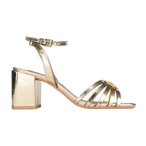 Sandália com bico quadrado e salto grosso, apresenta fechamento em fivela e um detalhe em metal dourado na parte frontal, trazendo um toque de sofisticação e estilo. Ideal para looks elegantes e confortáveis.