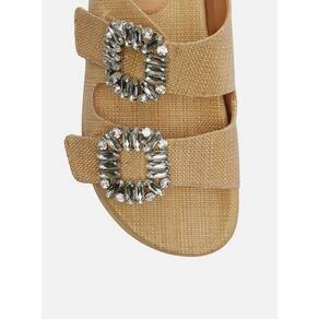 Descrição: Sandália bege em fibra natural. O modelo tem salto baixo, palmilha com formato anatômico e inscrição do nome da marca. Possui solado flatform tratorado branco e bico redondo. Traz tiras largas sobre os dedos e o peito do pé com fivelas quadradas grandes e aplicação de pedrarias.