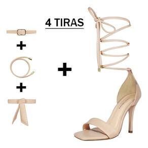 Linha de Sandália Salto Alto Fino Luiza Sobreira, produzida em material sintético na cor Amêndoa, com palmilha e forro em P.U., solado em TR, bico quadrado e fivela ajustável para fechamento.