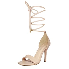 Linha de Sandália Salto Alto Fino Luiza Sobreira, produzida em material sintético na cor Amêndoa, com palmilha e forro em P.U., solado em TR, bico quadrado e fivela ajustável para fechamento.