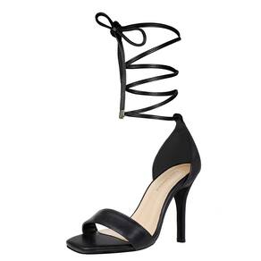 Linha de Sandália Salto Alto Fino Luiza Sobreira, produzida em material sintético na cor Preta, com palmilha e forro em P.U., solado em TR, bico quadrado e fivela ajustável para fechamento.