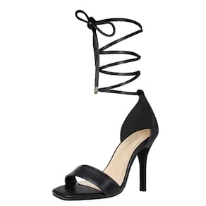Linha de Sandália Salto Alto Fino Luiza Sobreira, produzida em material sintético na cor Preta, com palmilha e forro em P.U., solado em TR, bico quadrado e fivela ajustável para fechamento.