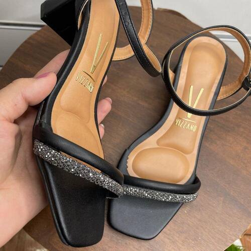 Sandália feminina Vizzano confeccionada em material alternativo pelica. Modelo com duas tiras finas frontais uma tira com strass, tira no tornozelo com fechamento por fivela com 7 níveis de ajuste, salto grosso forrado com 6,5 cm de altura, solado emborrachado antiderrapante e forro em material sintético.Sandália sofisticada, ideal para casamentos, festas e eventos.