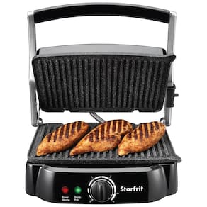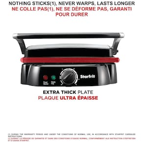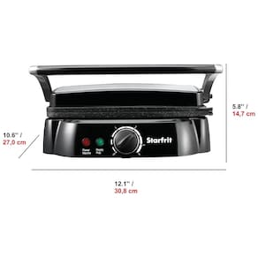Sanduicheira com grelhas removíveis, dobradiça flutuante auto ajustável, cobertura de aço inoxidável e tecnologia The Rock para aquecimento uniforme e antiaderência.Funciona como grill