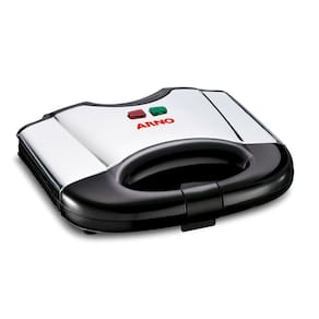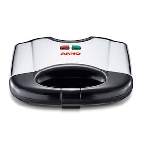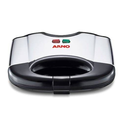 Sanduicheira Arno Compacta Grill Inox com placas antiaderentes, alça fria, luz indicadora de preparo e design compacto.Funciona como grill