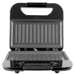 Material: Plástico e Alumínio. \nPlacas onduladas com revestimento antiaderente; \nFaz 2 sanduíches de uma só vez; \nGrelha hambúrgueres, carnes, peixes e vegetais; \nLuz indicadora de funcionamento -vermelha-; \nLuz indicadora de aquecimento -verde-; \nTrava de fechamento; \nBase antiderrapante; \nPode ser guardado na posição vertical; \nAlça para transporte; \nPorta-fio;Funciona como grill