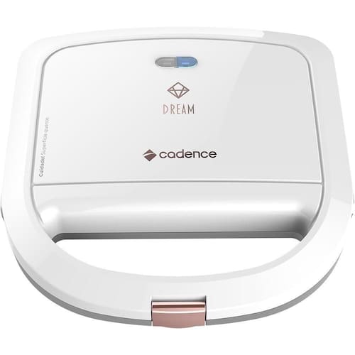 Sanduicheira Cadence Dream Rosé Gold com acabamento em rosé gold, capacidade para dois sanduíches, chapas antiaderentes, alça isotérmica, porta fio, led luminoso, termostato, pés antiderrapantes e trava de segurança.Funciona como grill