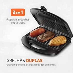 CARACTERÍSTICAS: - Cor: Preta - Voltagem: 110V - Potência: 750W - 2 em 1: Prepara deliciosos lanches e grelhados - Grelhas duplas: Grelham por igual os dois lados do alimento - Revestimento antiaderente: Os alimentos deslizam com mais facilidade - Trava de fechamento: Permite perfeita acomodação dos alimentos no interior do grill - Lâmpada piloto: Indica o funcionamento do aparelho - Controle de temperatura automático: Garante resultados perfeitos para os seus grelhados e sanduíches - Você pode preparar: carnes, legumes, sanduíches e muito mais Marca: Não Informado